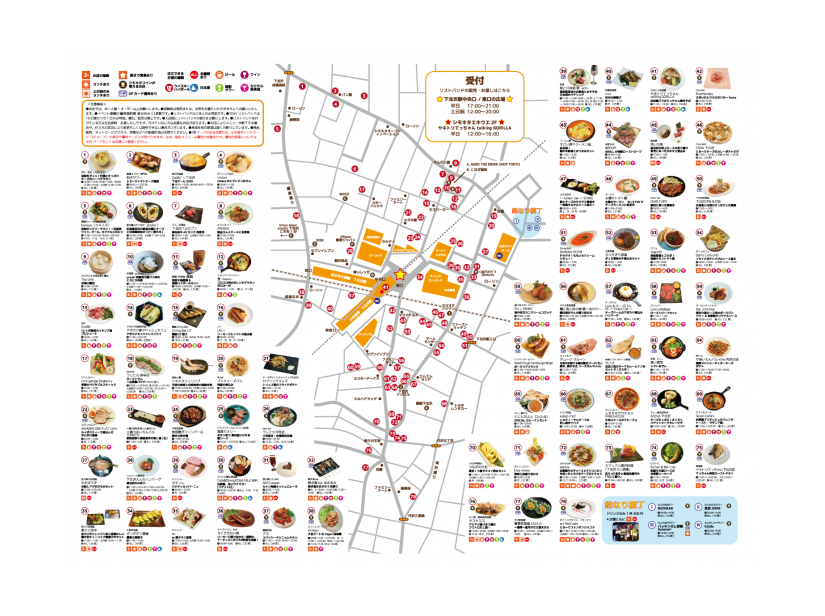 | 参加方法 | リストバンド(参加証)を購入して呑み歩きをしながらスタンプラリーを楽しんでもらいます。リストバンドを付けているお客さまは参加店82店舗でチャージ・お通し・席料はかからず気軽にはしご酒ができます。お店のスタッフや参加者同士で乾杯して盛り上がろう! |