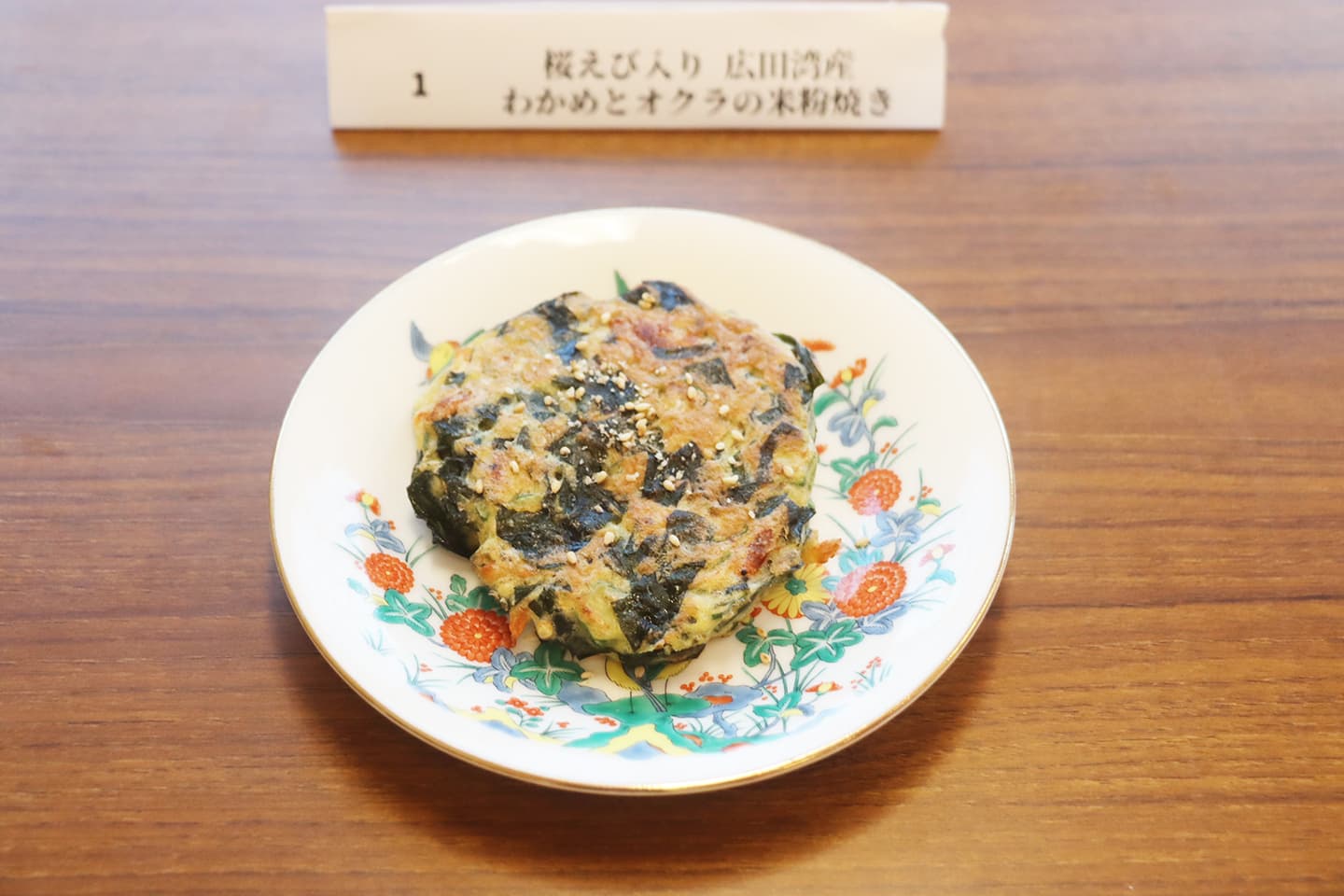 桜えび入り 広田湾産わかめとオクラの米粉焼き